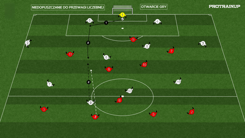 W momencie otwarcia gry bardzo często przeciwnik ma przewagę liczebną. Stanowi ją aktywna gra bramkarza nogami, który chętnie uczestniczy w rozgrywaniu akcji. Dodatkowo napastnik przeciwnika wiąże swoim ustawieniem dwójkę środkowych obrońców przez co działania naszego zespołu są ograniczone. Przykładowo jeśli środkowy napastnik schodzi nisko, aby stworzyć przewagę do samego końca może podążać środkowy obrońca. W tym momencie defensywny pomocnik asekuruje wyjście obrońcy.
